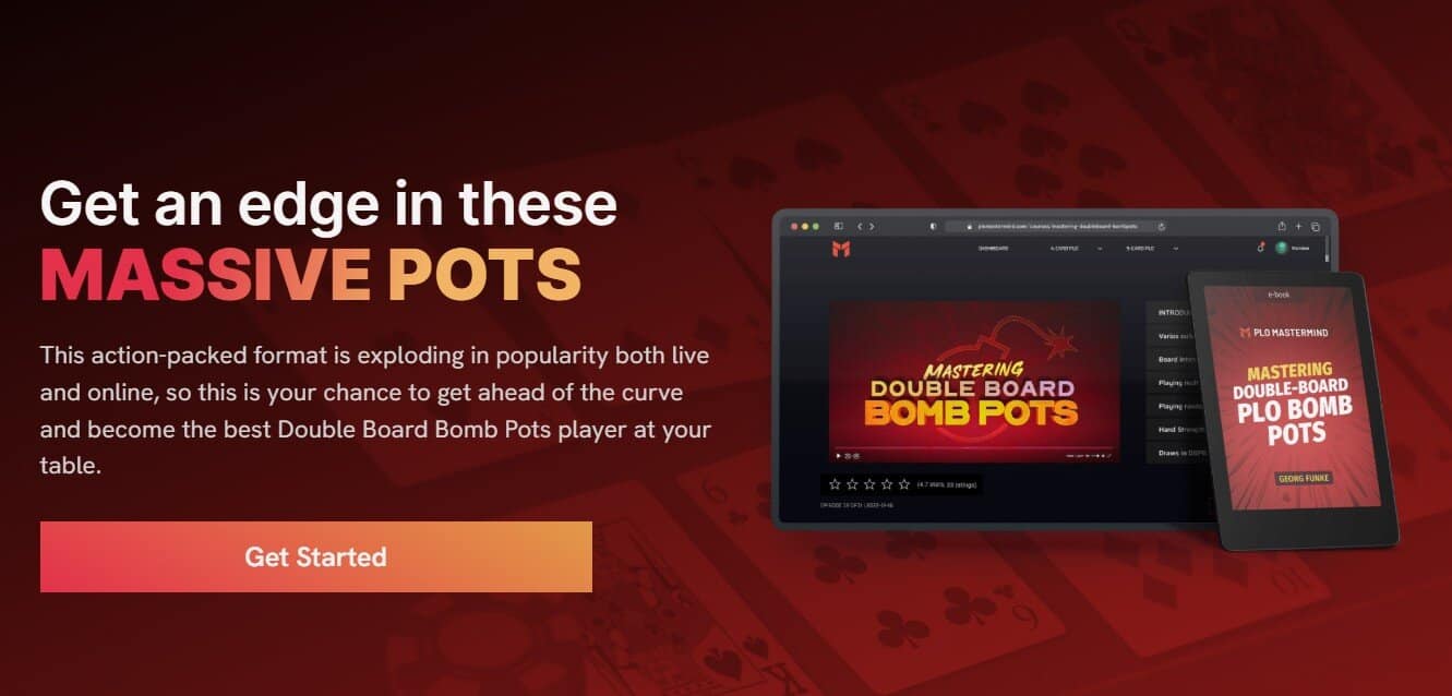 No. Your monthly PLO Mastermind membership covers the general library, software, and community. Mastering Double Board Bomb Pots is a specialized, standalone Pot Limit Omaha course designed for players who want deep-dive training. It requires a separate one-time purchase.