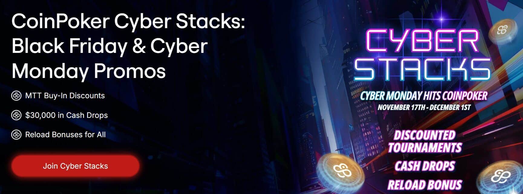 Cyber Stacks is CoinPoker’s Black Friday / Cyber Monday promo period. It runs from November 17 through December 1, covering two full weeks of boosted value.