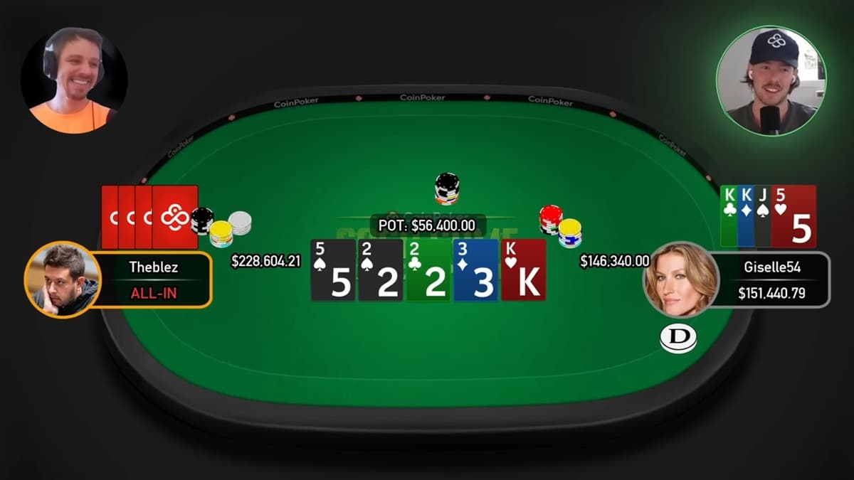 Warning: This is the highlight of the video. The setup is the stuff of nightmares. Giselle54 vs. Theblez at $100/$200. Deep stacks. A 3-bet pot. Theblez flops massively. Giselle rivers the world. By the river, there is over $513,000 in the middle, and one player faces an all-in decision for a quarter of a million dollars. Venividi describes the feeling perfectly: “You push your chair back, sit on two knees, and click the call button… sick to your stomach.”