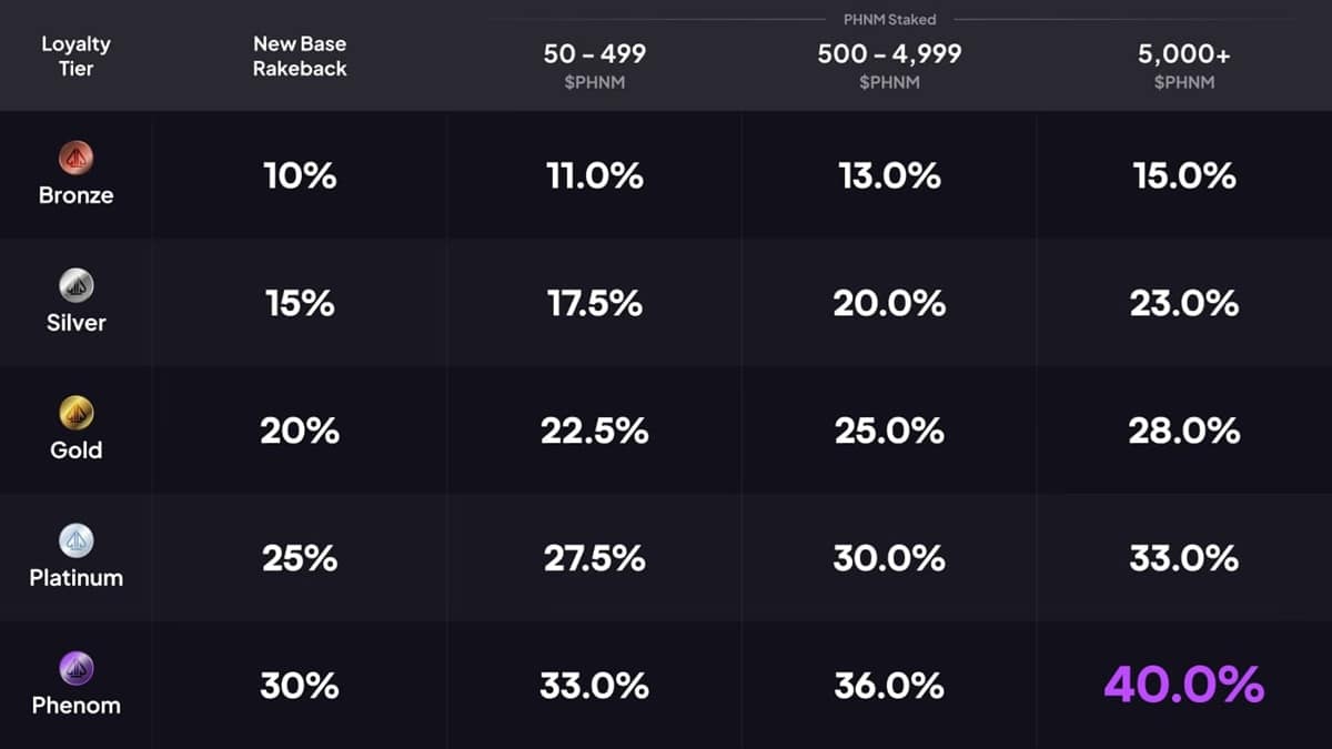 - The Strategy: Stake 5,000 $PHNM to lock in 33% rakeback immediately (Platinum). Then, grind the necessary volume to hit the Phenom tier, which unlocks the massive 40% cap.