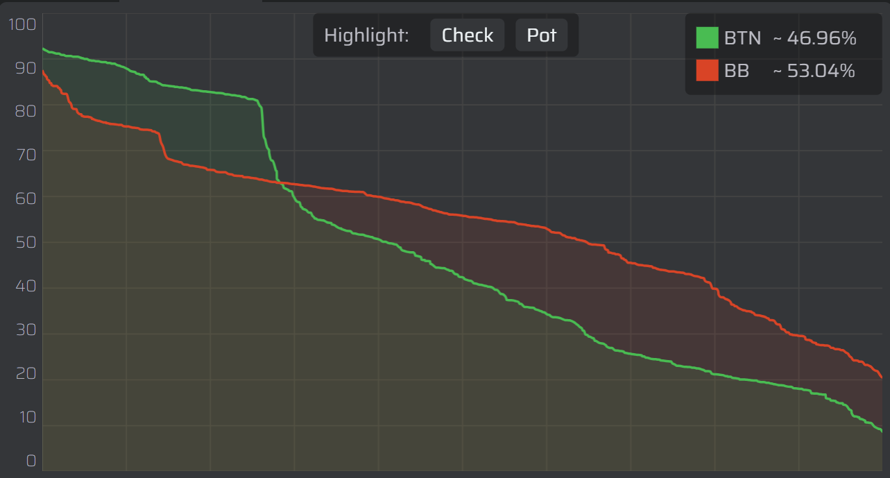First, look at the top left of the graph. You’ll see your green line (BTN) is way above the Big Blind’s. This means you have the “nut advantage”.