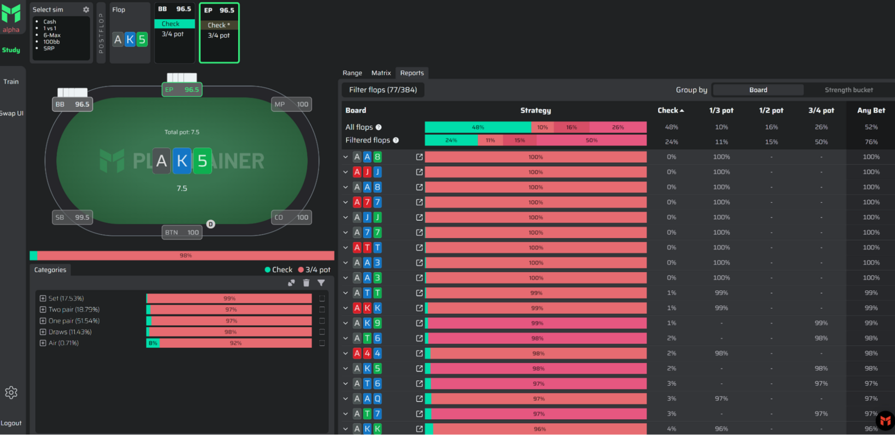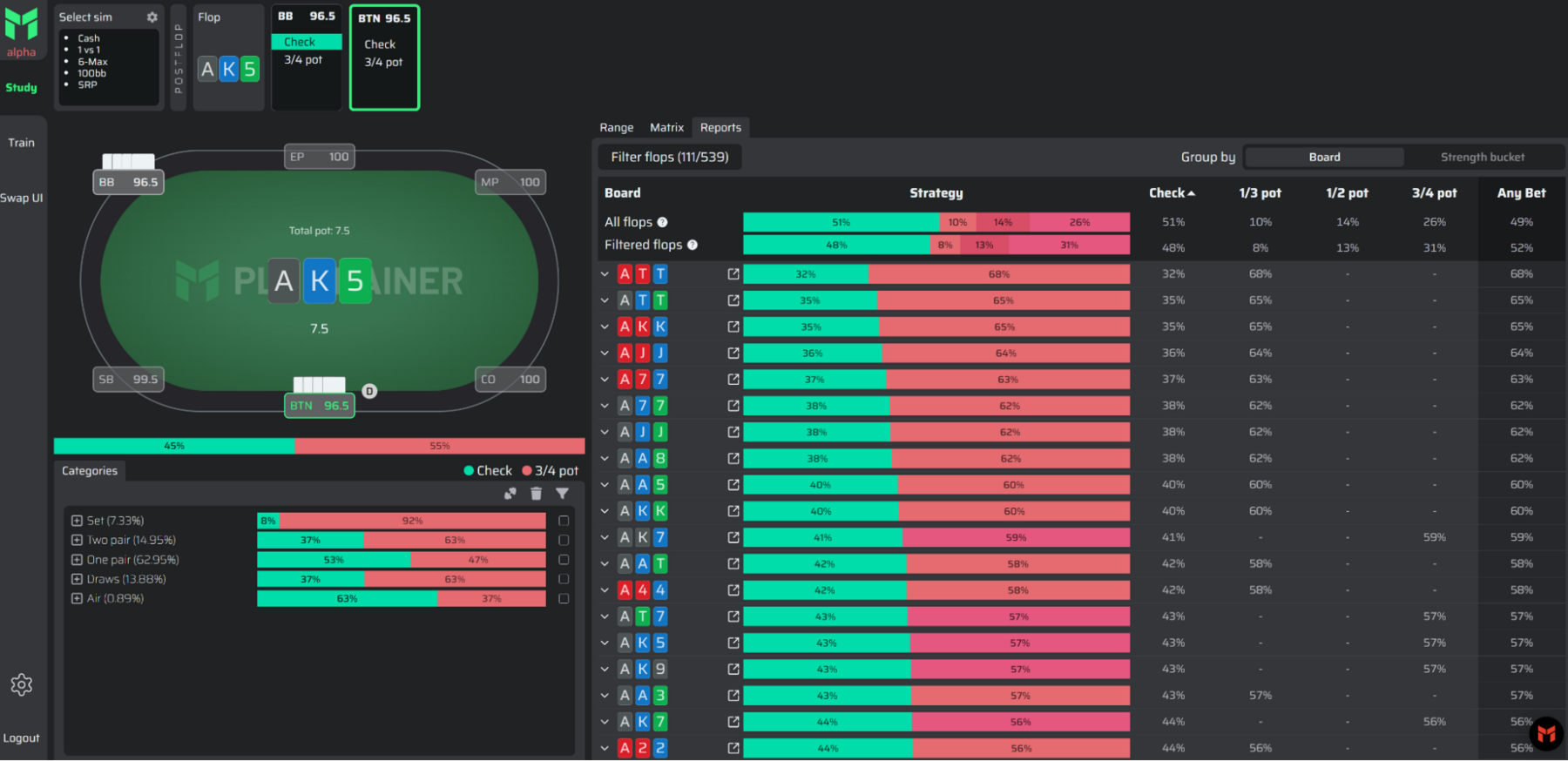 To get a grip on the overall strategy for this spot, I used a new tool we just added to the PLO Trainer called Aggregated Reports, which shows you the optimal actions for all possible flops at once.