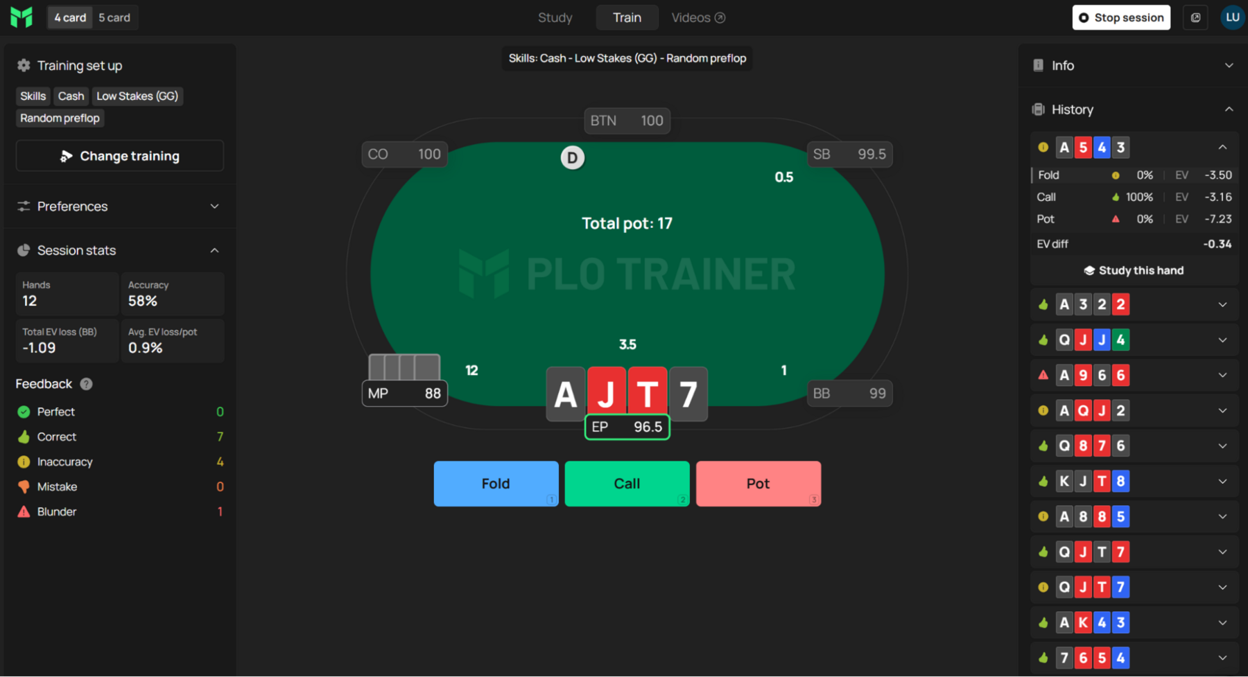 - Bankroll protection. Preflop leaks at PLO stakes move real money quickly. Sharper PLO Trainer preflop choices mean fewer thin calls, better 3-bet construction, and cleaner folds in rakey pools.