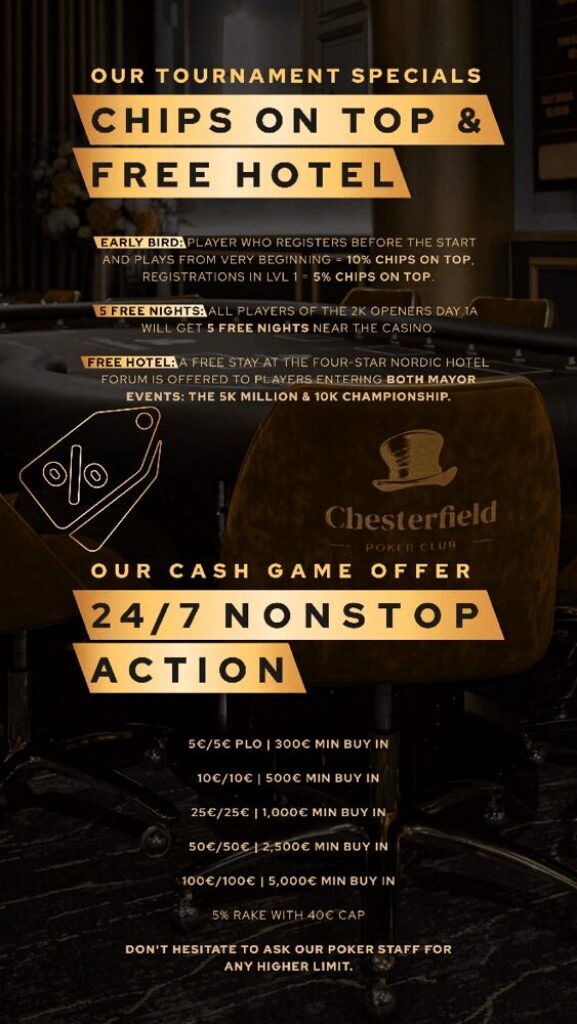 Now, here’s where it gets even better. The organizers are offering free accommodation at the Nordic Forum Hotel for players in the €5,200 and €10,300 events. That’s right – you can save your money for the tables and enjoy a comfy stay on the house. Talk about a sweet deal!