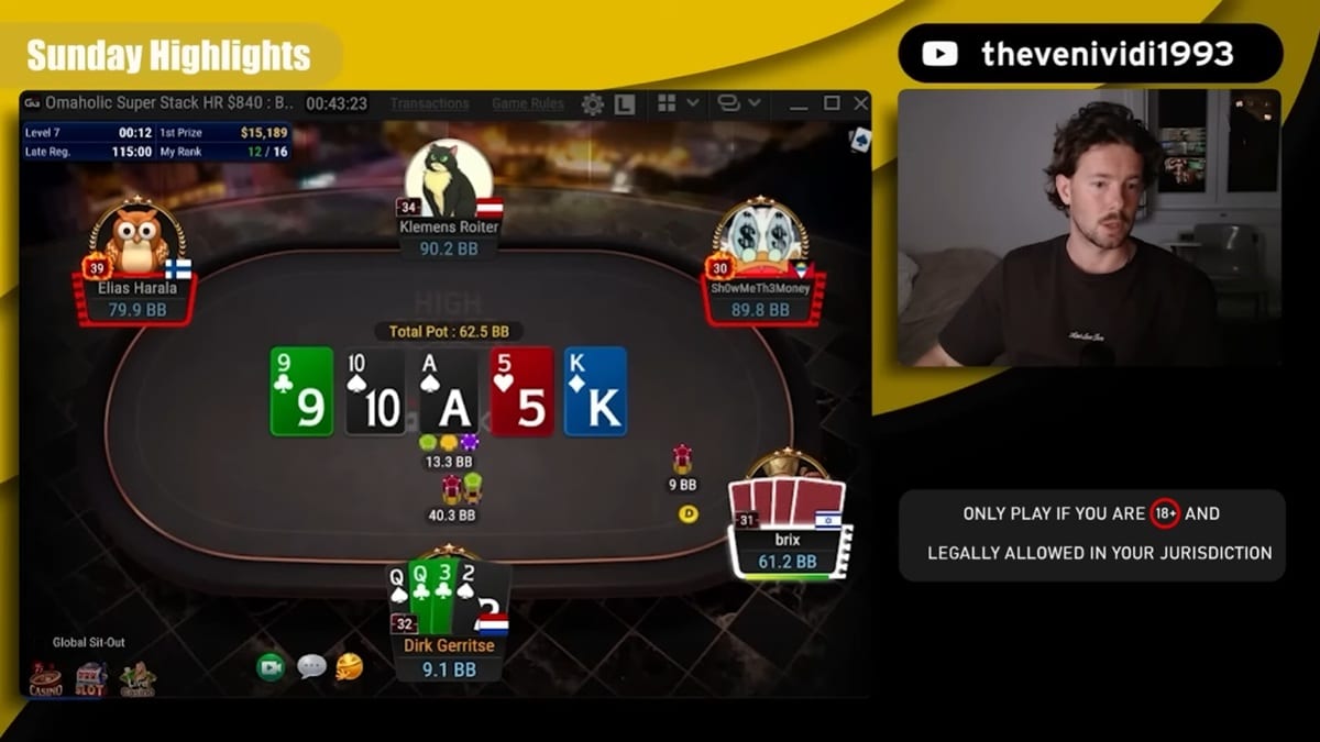 After a quiet period on YouTube, Dutch high-stakes regular Dirk Gerritse (aka venividi1993) has dropped a rare recap of his Sunday grind. Titled “HUGE STREAM WITH 3 FINAL TABLES!”, the 24-minute video offers a masterclass in navigating deep-stacked Pot Limit Omaha tournaments.